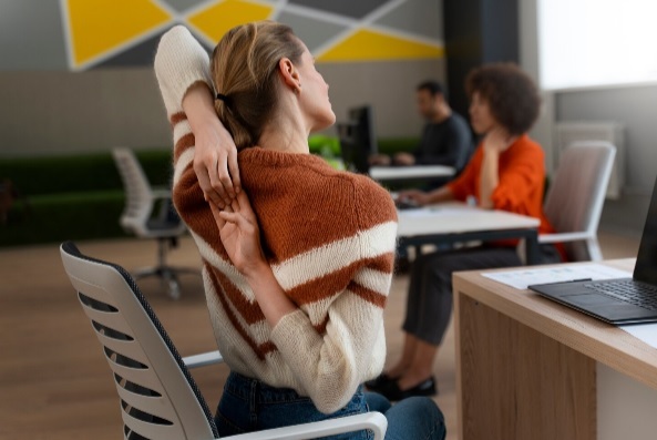 Верхня частина тіла страждає найбільше. М'язи шиї стискаються, плечі піднімаються до вух, з'являється головний біль. Розтягнути цю зону можна навіть не відходячи від столу.