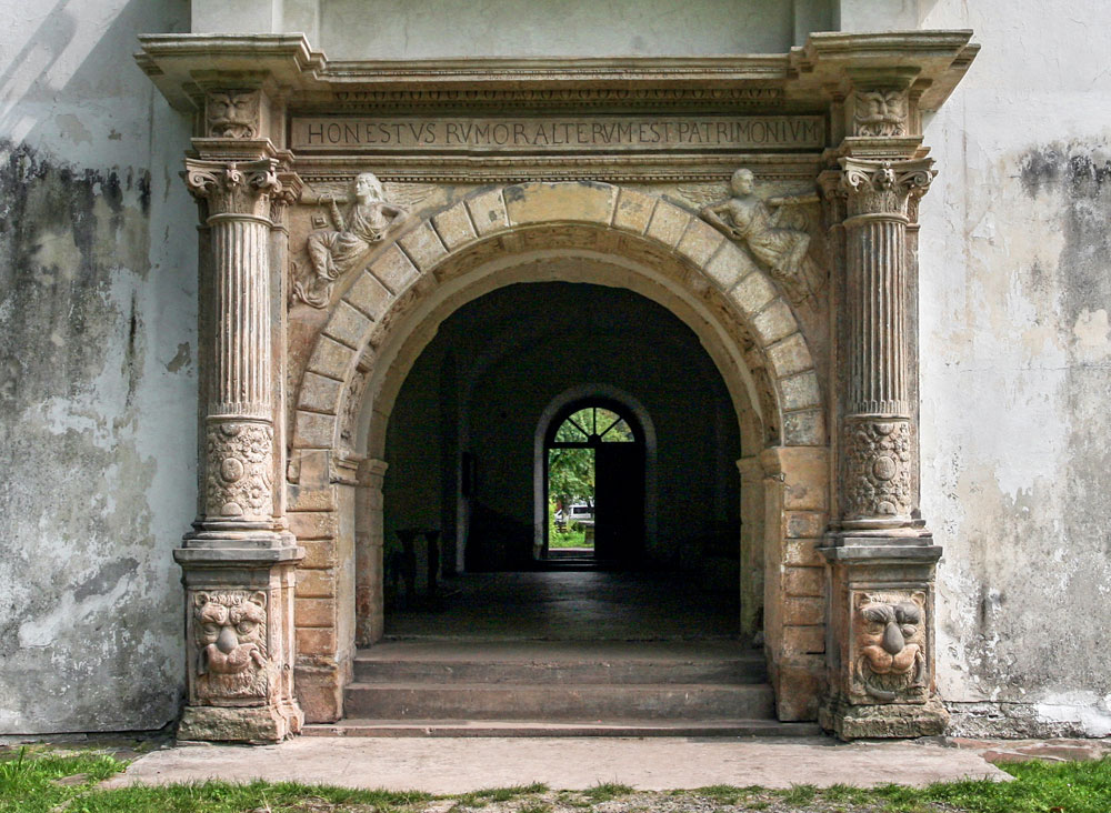 Арку довкола проїзду теж незле декоровано — різьблення, маскарони тощо. Але все те блякне на тлі зовнішнього порталу. Тут і пишно оздоблені колони, і крилаті богині перемоги, і маскарони, і пики левів... Поверху напис латиною: «Honestus rumor alterum est patrimonium» («Добра слава — також спадок», — девіз родини Понятовських — авт.). Фронтон над цією красою прикрашено аналогічною гербовою композіцією, що й зі сторони двору («Цьолек», «Погоня», мілітарій та корона).