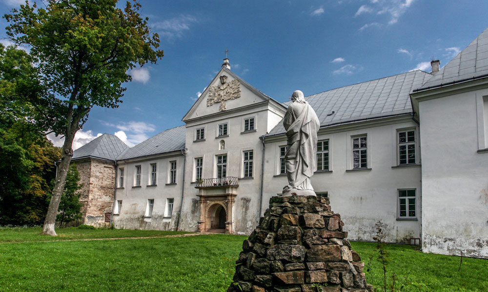 Подвір'я нижнього замку. Добре видно, де монастирська, а де санаторна його частини. По центру — брама та фронтон із гербами