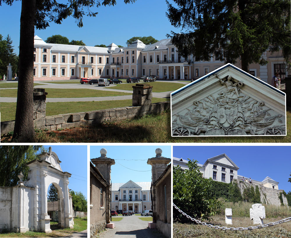 Від первісного палацу дивом уцілів «гербовий» фронтон над головним входом. По його центру знаходиться герб Вишневецьких «Корибут», та «Труби» — фамільний герб Теклі Рози Радзивіл (третя дружини Михайла Сервація Вишневецького). Вони увінчані княжою короною, що вказує на непростий статус власників. Знизу герби підтримують два пухкеньких оголених малюка-«путті». «Путті» були дуже популярним сюжетом в мистецтві XVIII століття. І, звісно, мілітарій — як без нього?