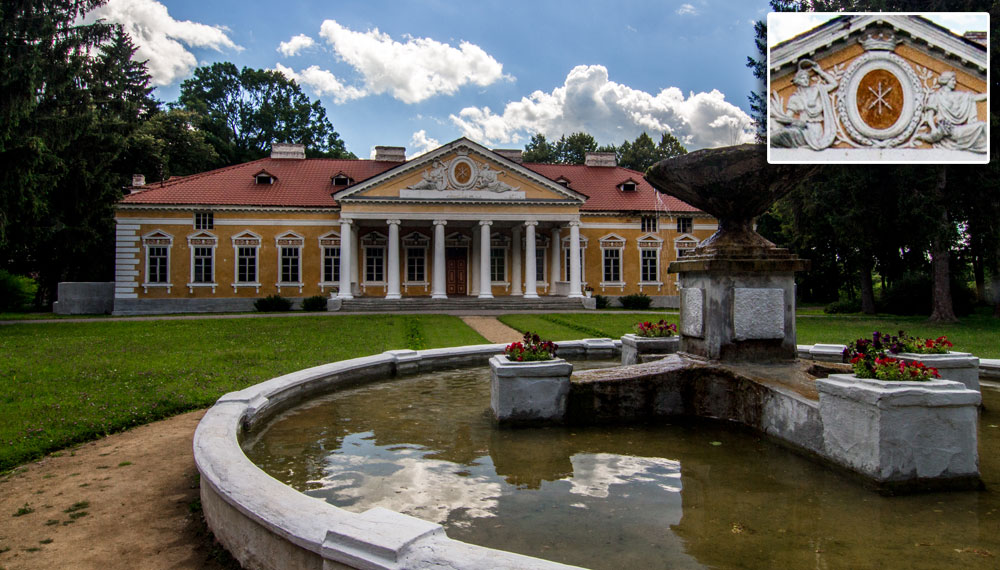Прикрашений левами вхід, що сьогодні використовується як головний, від початку використовувався як другорядний. Парадний був з протилежного боку. Його фронтон прикрашають барельєфи Афродіти-Венери та Деметри-Церери, між якими знаходиться увінчаний дворянською короною овальний геральдичний щит з трьома перехрещеними лицарськими списами. Це — «Єліта», фамільний герб родини Чечелів.