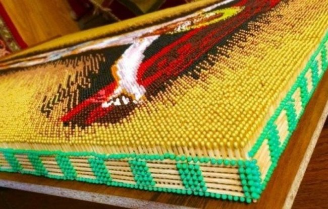Купив малюнок із зображенням, розбив його на кубики-схему, і так робив за зразком потрібний виріб. Кожен сірничок фарбував у потрібний колір, підсушував і складав цілісність картини.