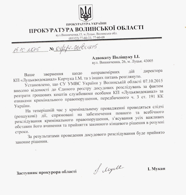 Наразі відкрито кримінальне провадження за фактом розтрати грошових коштів службовими особами КП «Луцькводоканал» за ознаками кримінального порушення, передбаченого частиною 3 статті 191 КК України. Відомості внесено до єдиного реєстру досудових розслідувань.