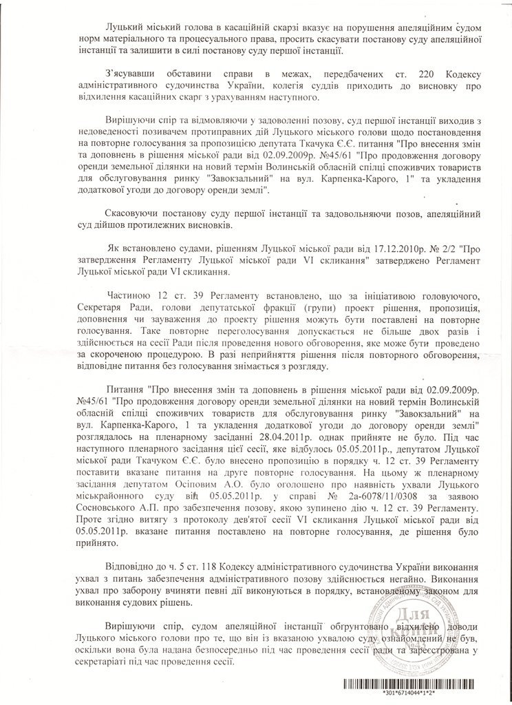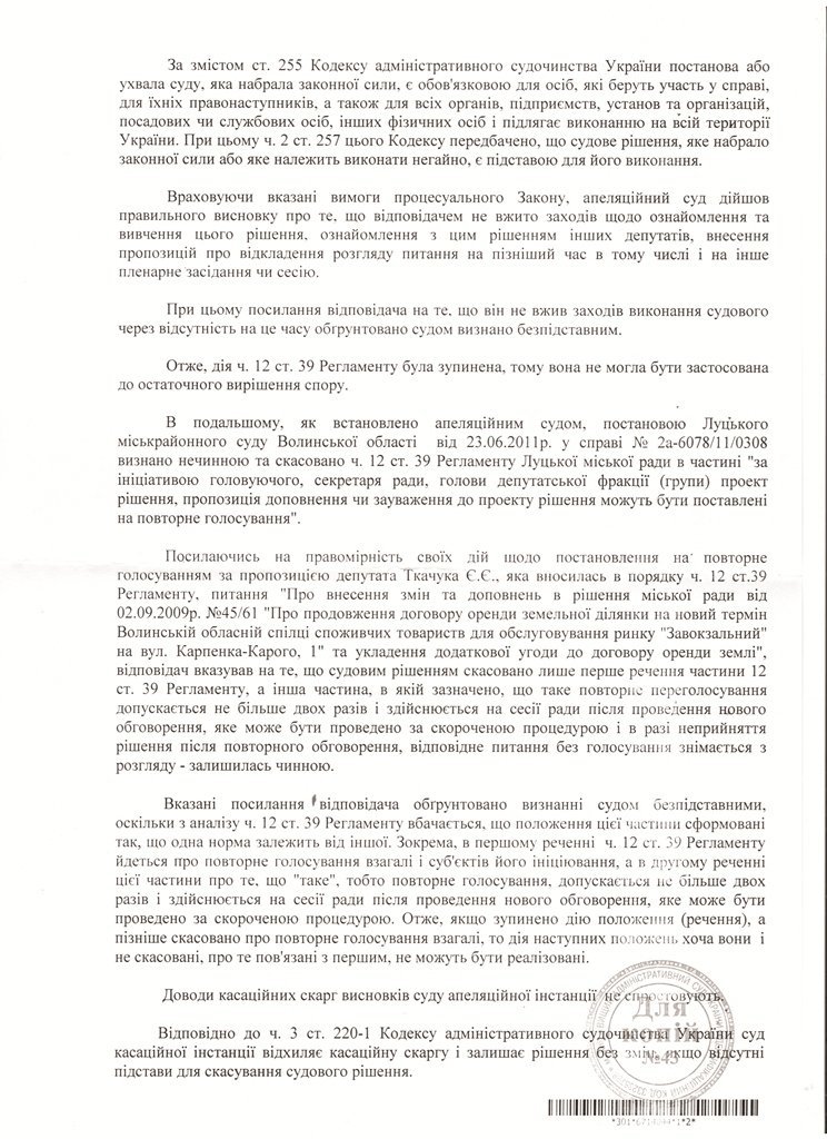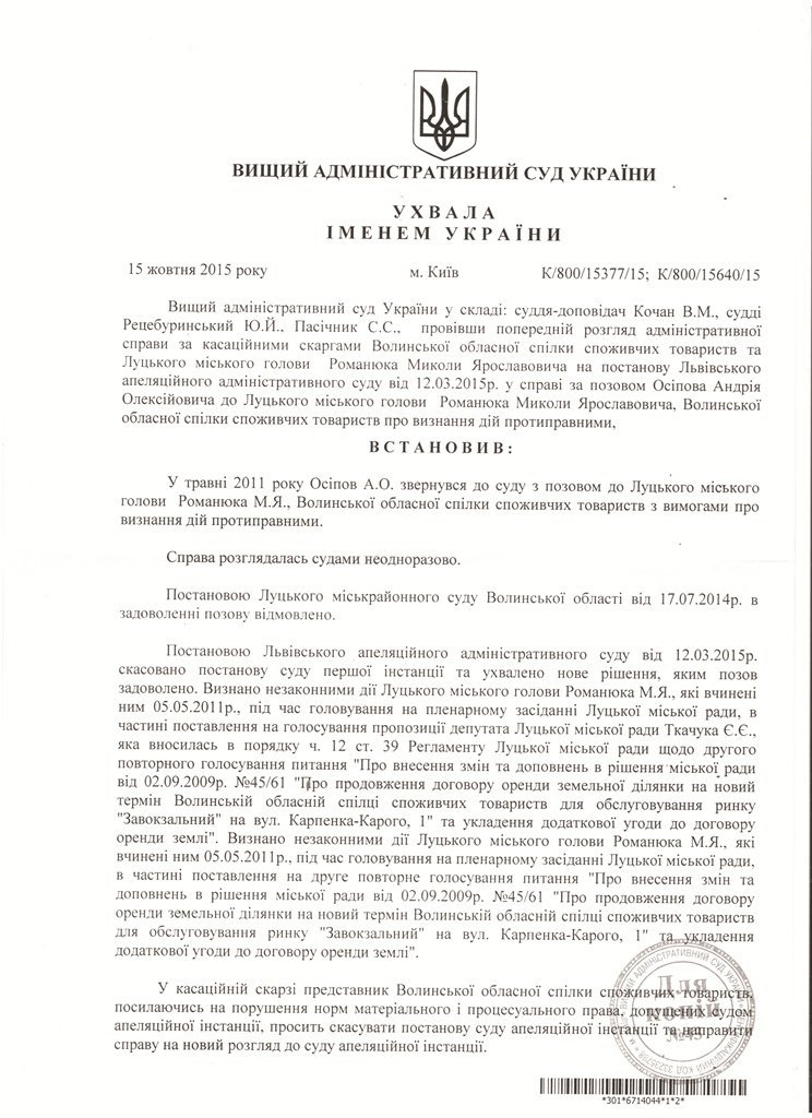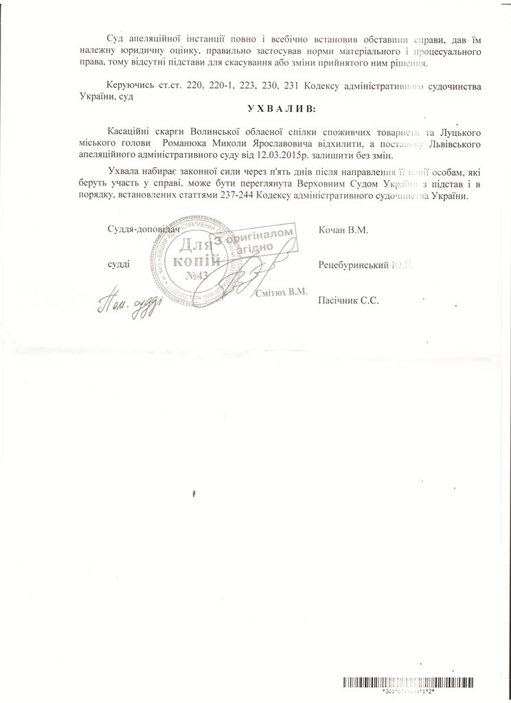 Микола Романюк та Волинська облспоживспілка оскаржили це рішення до Вищого адміністративного суду України. Нещодавно стало відомо, що касаційний суд ухвалою від 15.10.2015 року відхилив скарги. Отже, в цьому спорі поставлена крапка. Кінцево встановлено, що луцький міський голова Микола Романюк діяв протизаконно. Отже, це означає, що земля передана в довготривалу оренду облспоживспілці також протиправно.