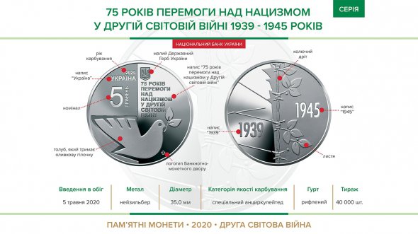 З 5 травня НБУ вводить в обіг нову монету номіналом 5 гривень, присвячену увічненню пам'яті і перемозі у Другій світовій війні, яка тривала шість років, повідомляє пресслужба регулятора.