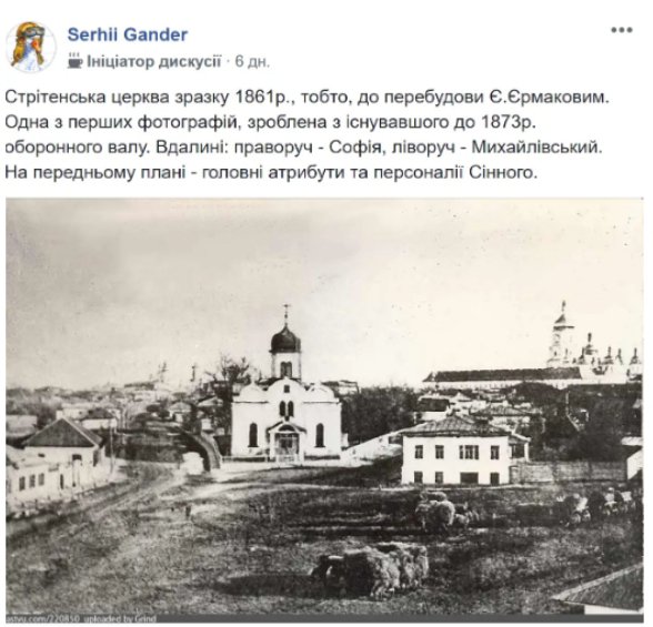 За словами чоловіка, на фото вдалині праворуч від Стрітенської церкви видно Софійський собор, а ліворуч – Михайлівський золотоверхий монастир.