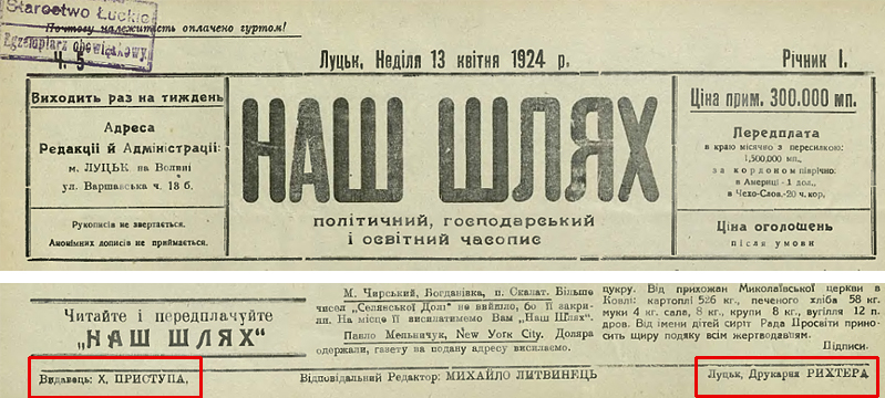 Цікаво, що Ріхтер сам уже мав зв’язок із Приступою. Адже у його друкарні виходила газета «Наш шлях», видавцем якої був Хома Приступа. Це не була добра співпраця, адже «Наш шлях» не один раз конфісковували разом із друкарськими формами для відбитків, що ймовірно було збитково для друкарні.