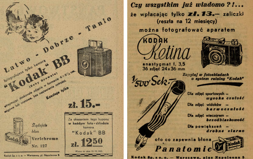 Ще одна новинка 1934 року, доступна для придбання в Луцьку, Kodak Retina. Ця модель – одна із перших використовувала в пізніший час популярний і основний формат 35 міліметрів. Не відставала і німецька Leica, яка першою пропонувала 35-мм формат. Камери Leica I та Leica II були дорожчі, їх використовували переважно професіонали, які фотографією заробляли на життя.