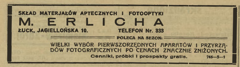 Але значно популярнішим був заклад М. Ерліха, де крім купівлі фотокамер та приладдя, пропонувалося обробити і надрукувати фото із відфотографованих пластин, що було дуже зручно для любителів фотографії, які не хотіли займатися хімічними процесами вдома. Лабораторія зі складом і магазином Ерліха розташовувалася на Ягеллонській неподалік мосту Казимира Великого і церкви Луцького братства.