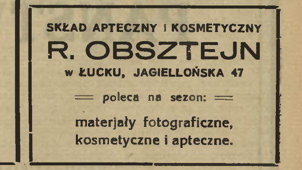 Першу рекламу про продаж фотоапаратів в Луцьку фіксуємо в 1924 році. У магазині З. Піновського на Ягеллонській, 58, окрім зброї, вогнегасників, друкарських машинок, термосів, ножів, бритв, запальничок, велосипедних запчастин, можна було придбати фотоапарати та різне фотоприладдя.