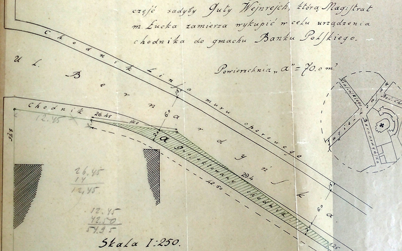 Другий епізод був пов’язаний із тим, що у 1925 році розпочалися роботи із будівництва Банку польського на вулиці Бернардинській. Це потягнуло за собою впорядкування і благоустрій усієї вулиці. Цю інвестицію вже мала робити міська влада. Проте сталося так, що ділянка Гути підходила впритул до проїзної частини Бернардинської. Отже, не було можливості влаштувати тротуар від банку до вулиці Ягеллонської. Йшлося про 70 квадратних метрів тротуару. Купити цю землю в Гути місто не могло, тож домовилося з нею про оренду. Так виник тротуар.