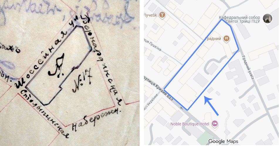 Ділянка Гути в 1919 році (зліва) і це місце на карті синім (справа)