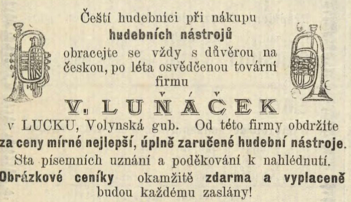 Чехи навіть відзначилися тим, що виготовляли в Луцьку музичні інструменти. Ідеться про фабрику дерев’яних та мідних духових інструментів Ростислава Лунячека, чеського уродженця Луцька. Відомо, що вона діяла перед Першою світовою війною. У своїх рекламних брошурах власник зазначав, що його інструментами користуються сотні музичних хорів та гуртів. Лунячек мав ілюстрований каталог, який відправляв замовникам на вимогу. Чи працювала ця фабрика в Луцьку після Першої світової, точно невідомо.