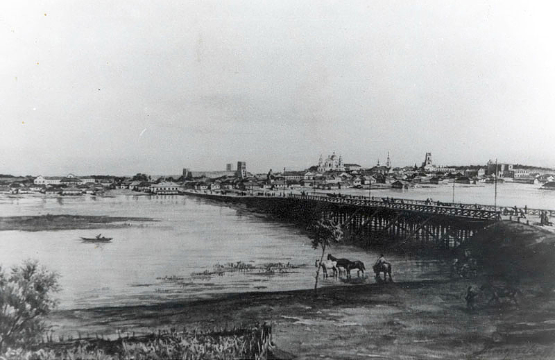 Ракурс із панорамою вибраний так, що не повторює попередніх. Художник (і фотограф) стояв на пагорбах Красного. У його поле зору потрапив міст, вся забудова острівної частини міста та приблизно третина пагорбу Заглушецького передмістя з монастирем тринітарів, тобто по нинішню вулицю Сенаторки Левчанівської. На передньому плані – незмінні атрибути тодішніх пейзажистів – човни, люди, тварини. На сьогодні володіємо тільки чорно-білою копією акварелі Конопацького.
