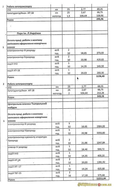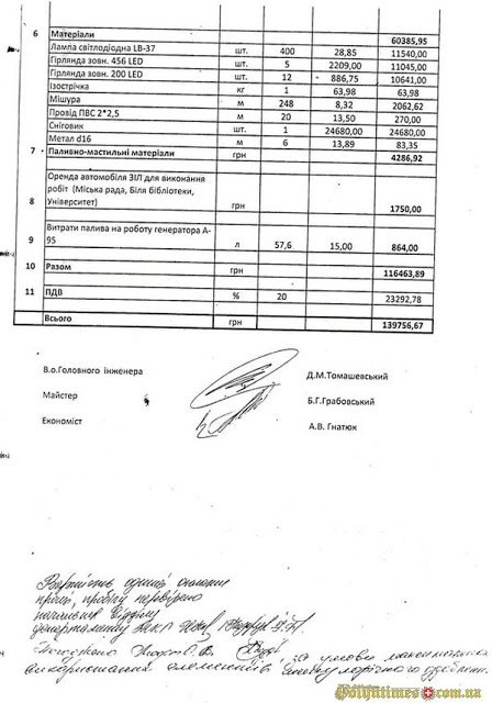 Хоч багато з гірлянд – минулорічні, на них все ж використали, згідно кошторису, 400 світлодіодних ламп LB З7 на 11 тис. 540 грн. Додатково закупили зовнішніх гірлянд 456 LED 5 шт. на 11 тис. 45 грн і 12 шт. 200 LED на 10 тис. 641 грн.