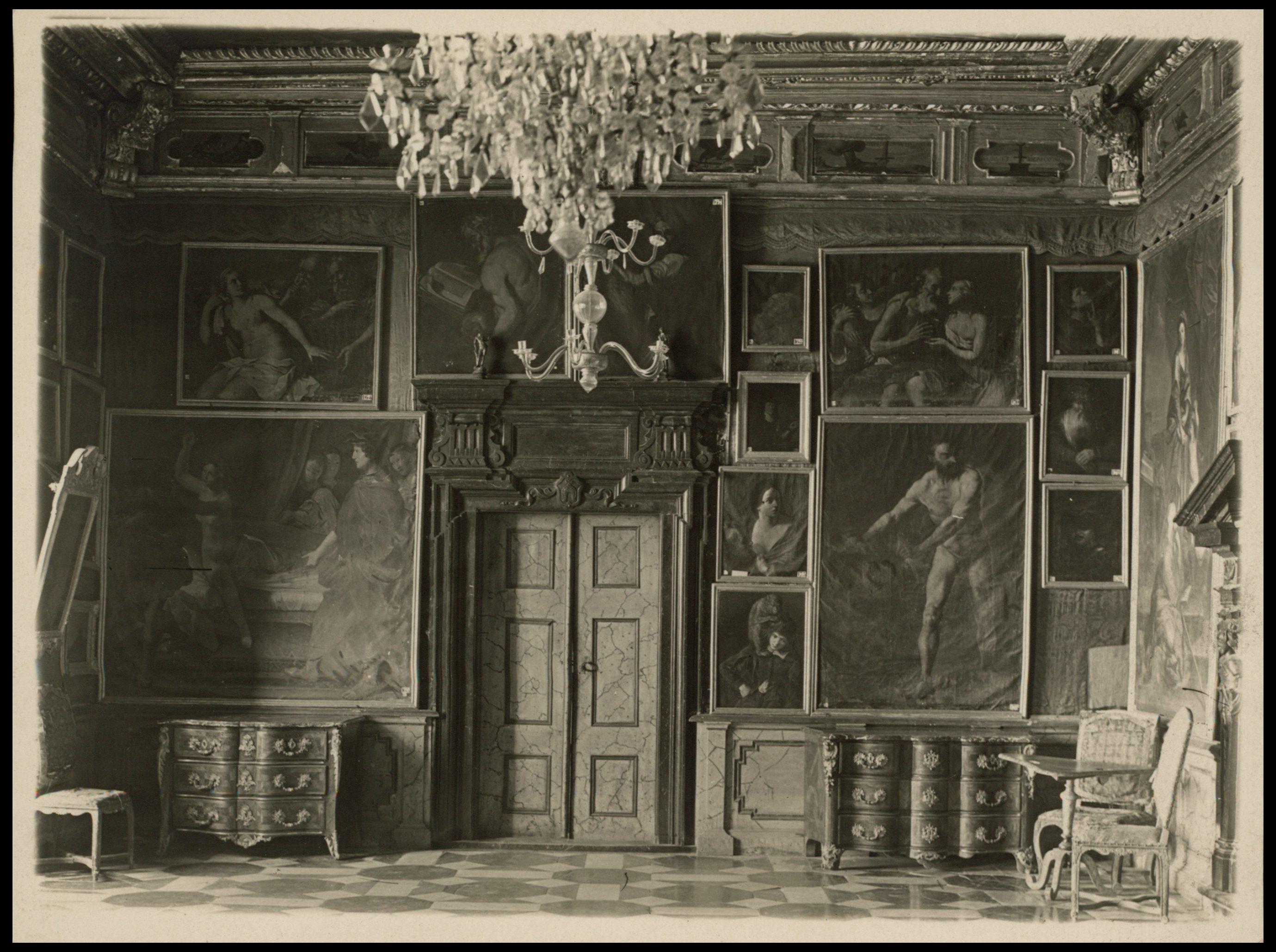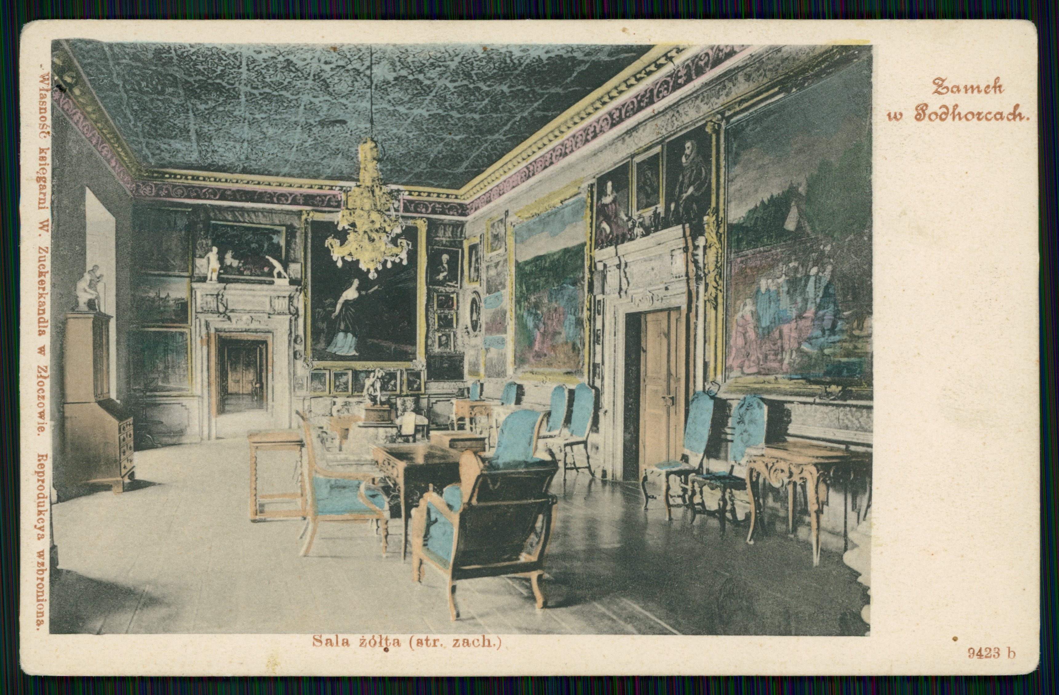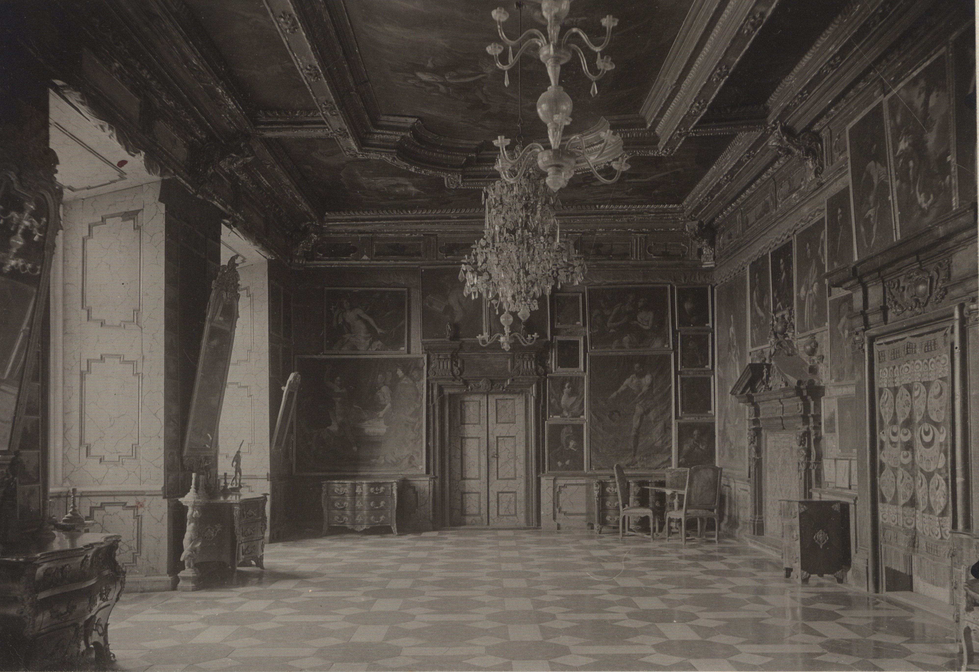 Розглядаючи столітні фото інтер’єрів палацу, помітно, що картини на стінах доволі схожі на всесвітньо відомі усім роботи. На жаль, оригінальних робіт в замку ніколи не було, однак прямі копії з робіт Рафаеля, Рубенса, Тіціана, Караваджо справді прикрашали стіни кімнат. Також тут висіли картини польського художника Чеховича, полотна Якоба де Баана на історичні теми — «Облога Смоленська» і «Прийом шведських і бранденбурзьких послів Володиславом IV». Навіть їдальню прикрашали портрет гетьмана Конецпольського на стелі та 72 портрети видатних політичних та духовних діячів, а також чорний мармуровий стіл, на якому хрестили короля Яна ІІІ.