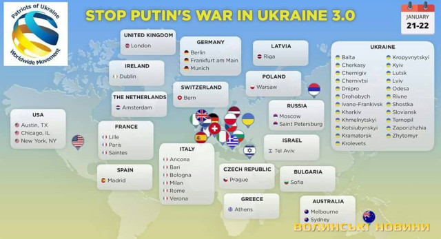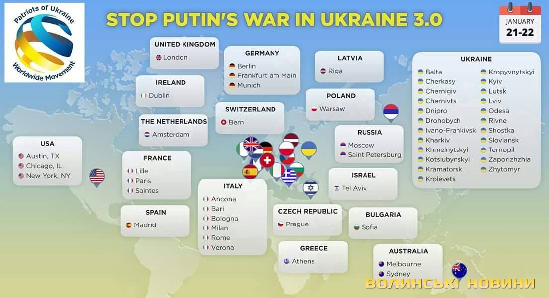 Акція носить всесвітній характер. Так, українська діаспора втретє організувала захід StopPutinsWarInUkraine в 18 країнах світу. Протести заплановані біля російських посольств в тих країнах світу, які підтримують Україну.